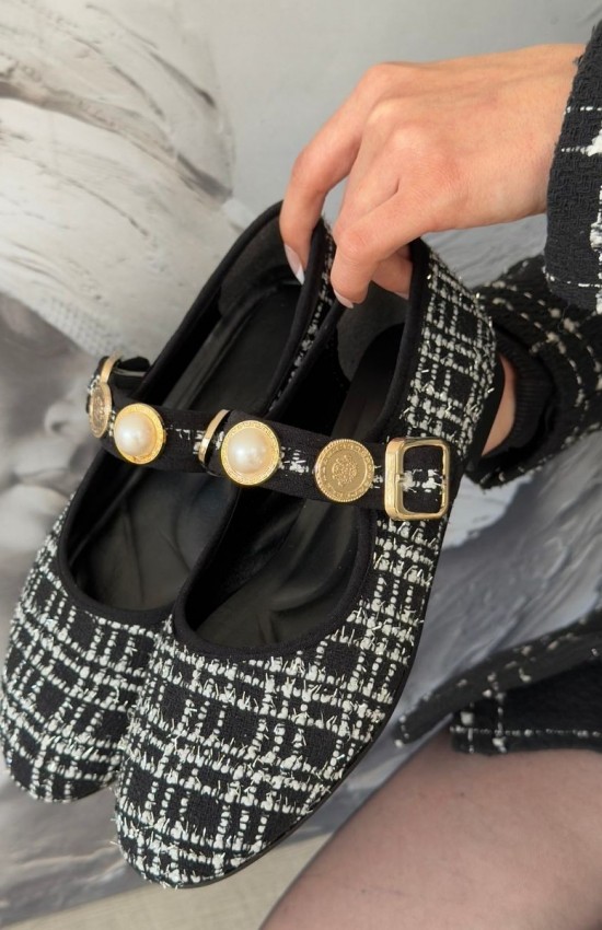 Hante Siyah Beyaz Keten Taşlı Babet Ayakkabı
