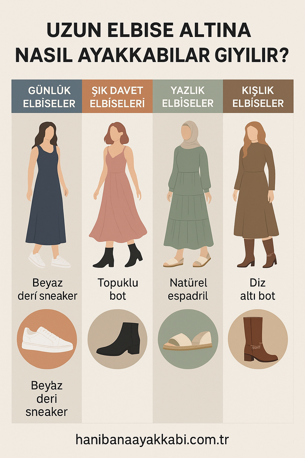 Uzun elbise altına giyilecek ayakkabı, tarzınızı yansıtmanın en önemli yollarından biridir. Seçeceğiniz modelin hem elbise ile uyumlu, hem de sizi rahat ettirmesi büyük önem taşır. Mevsim, tarz ve etkinliğe göre farklı kombinasyonlar deneyerek tarzınızı yansıtabilirsiniz.