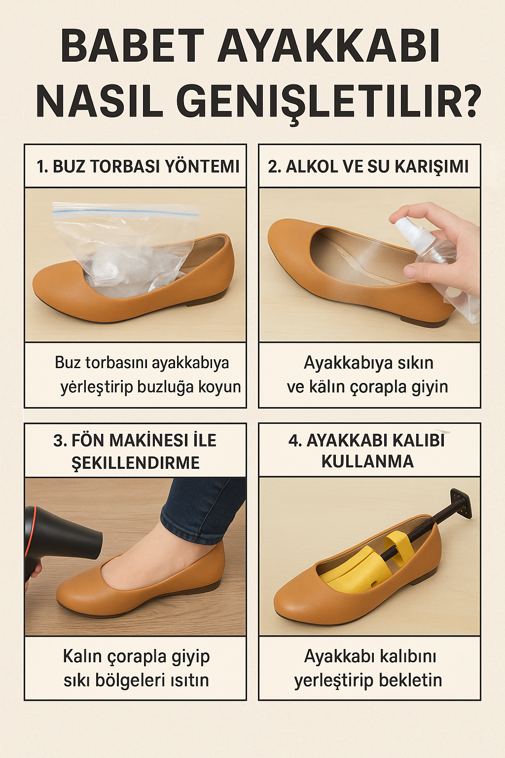 Yeni aldığınız ya da uzun süre giymediğiniz babet ayakkabılar ayağınızı sıkıyor mu? Topuğunuzu vuruyor, parmaklarınızı acıtıyor mu? Merak etmeyin, babet ayakkabınızı birkaç pratik yöntemle genişleterek konforlu hale getirebilirsiniz. Bu yazımızda evde kolayca uygulayabileceğiniz yöntemleri adım adım anlatıyoruz.