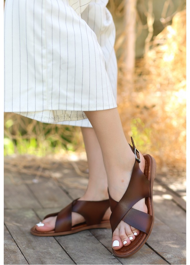 Çapraz Bantlı Kahverengi Sandalet: Rahat ve pratik bir modeldir.