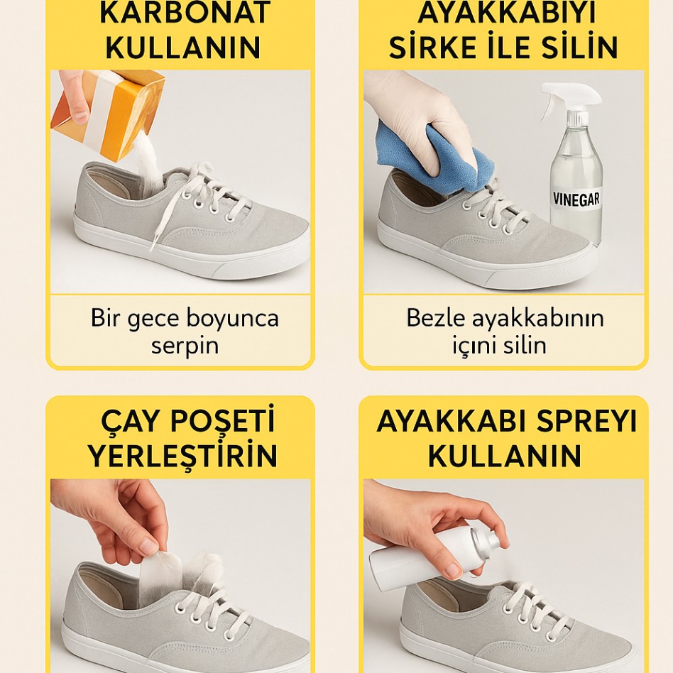 Karbonat: Ayakkabının içine bir gece boyunca 1 yemek kaşığı karbonat serpin, sabah boşaltın.