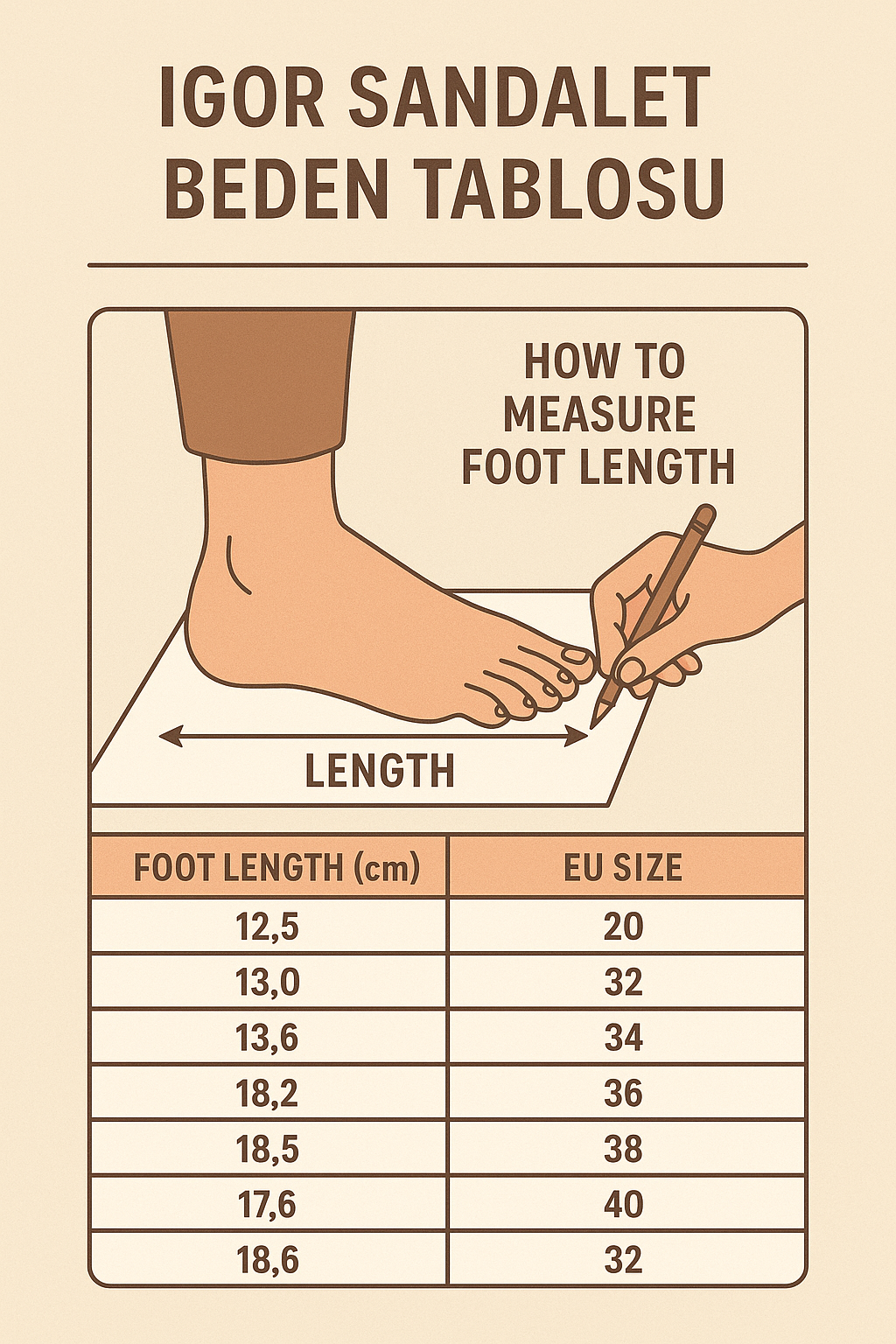 İgor sandalet beden tablosunu kullanarak, çocuğunuz ya da kendiniz için en uygun numarayı kolayca bulabilir, yazın keyfini konforla çıkarabilirsiniz.