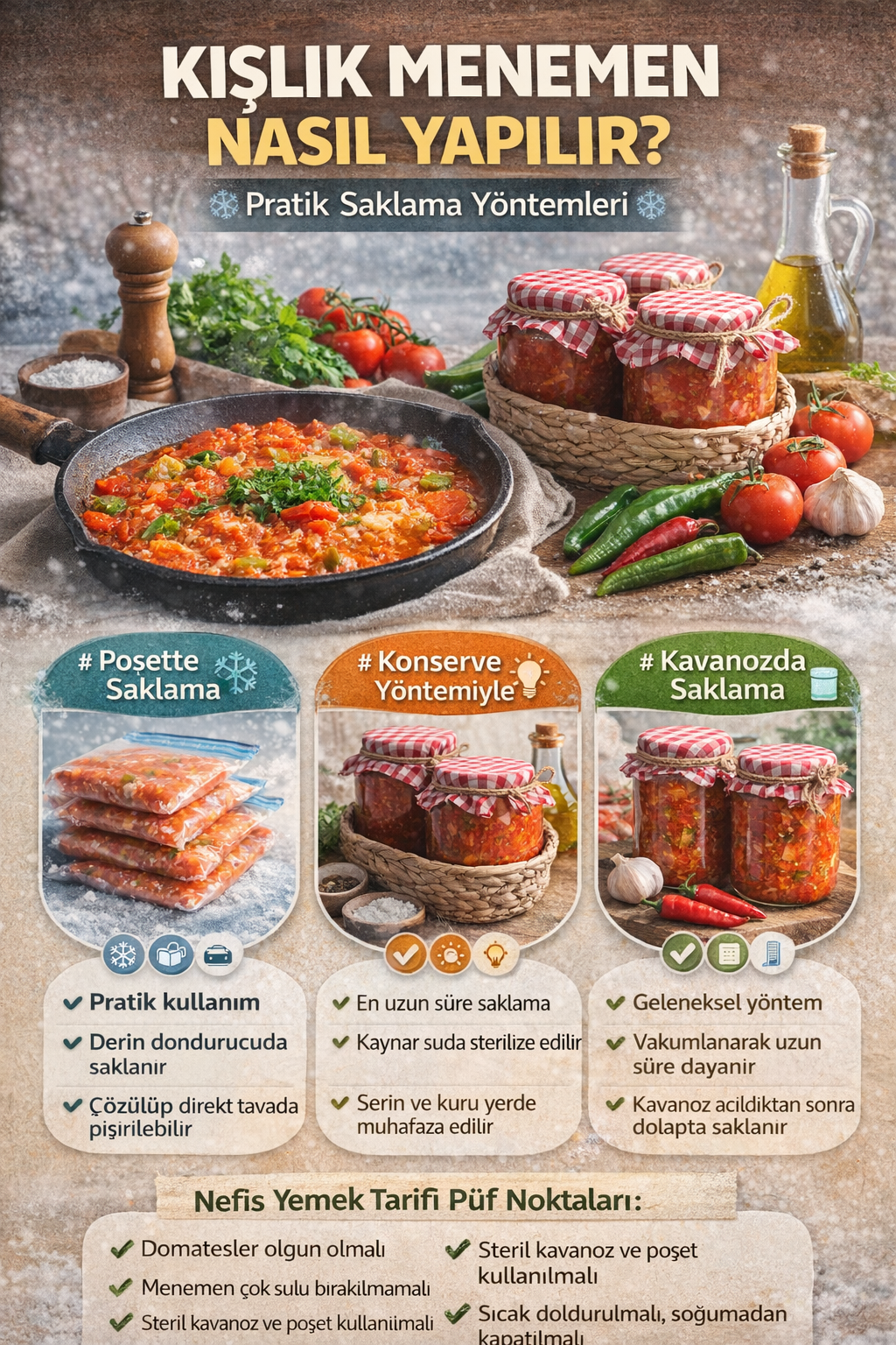 Bu yazımızda kışlık menemen nasıl yapılır, poşette kışlık menemen, konserve kışlık menemen ve kavanozda kışlık menemen yöntemlerini detaylı şekilde ele alıyoruz.