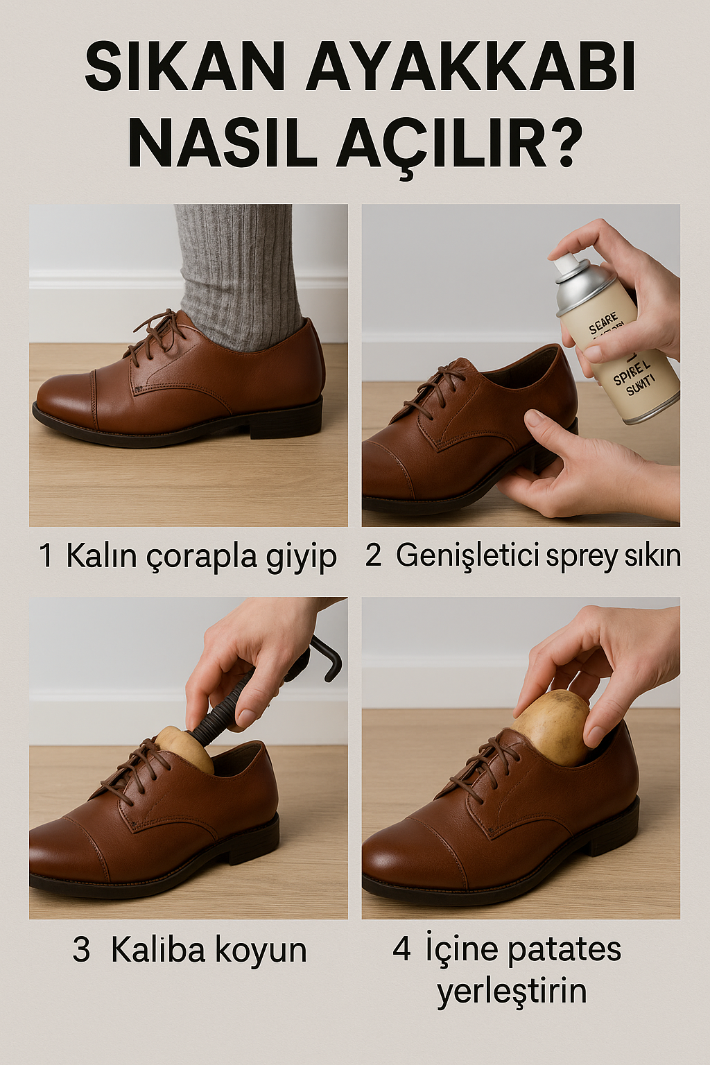 Ayakkabının içine büyük bir patates yerleştirip 1 gece bekletmek, doğal bir genişleme sağlar. (Deri olmayan ürünlerde kullanılmamalıdır.)